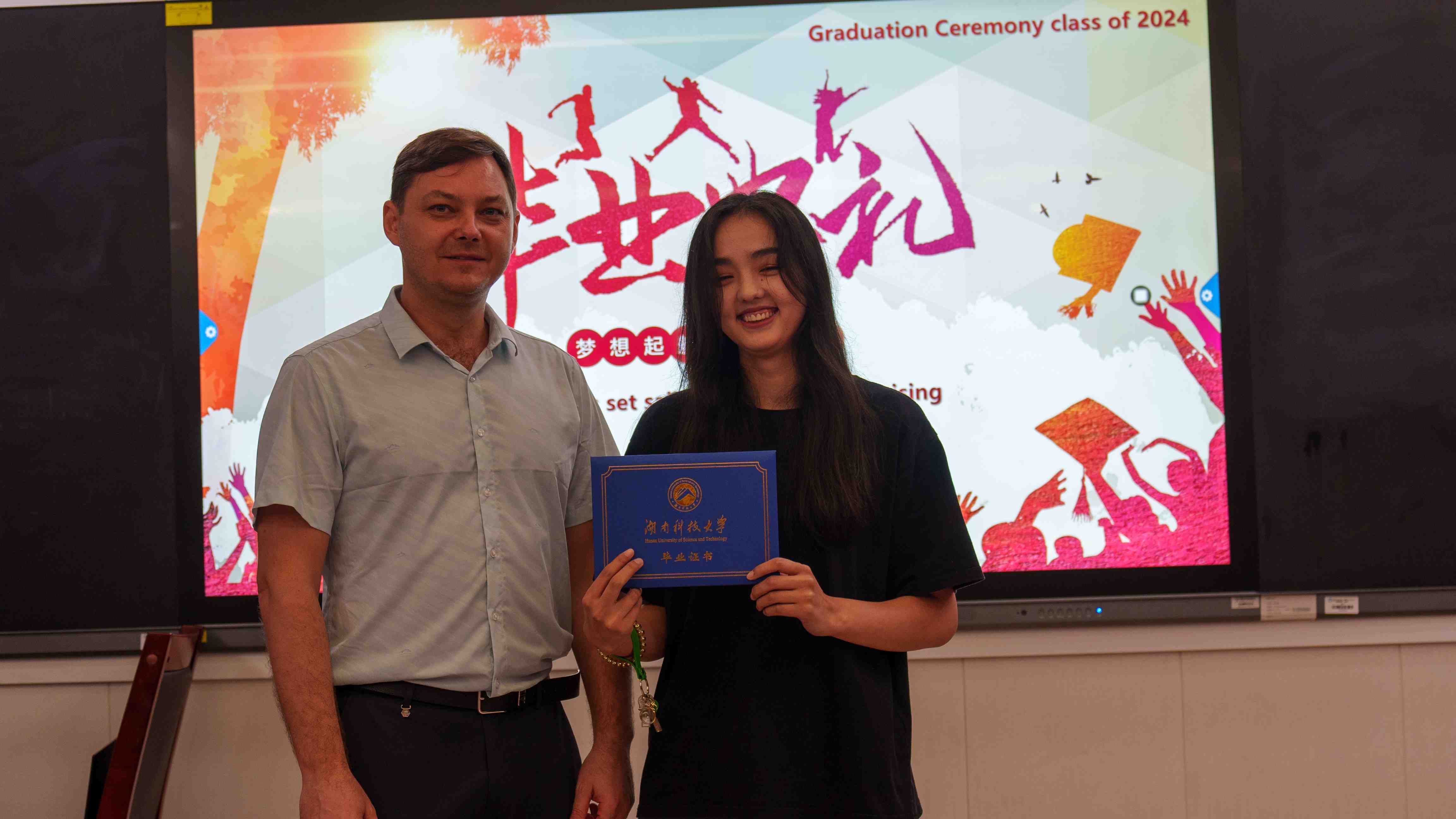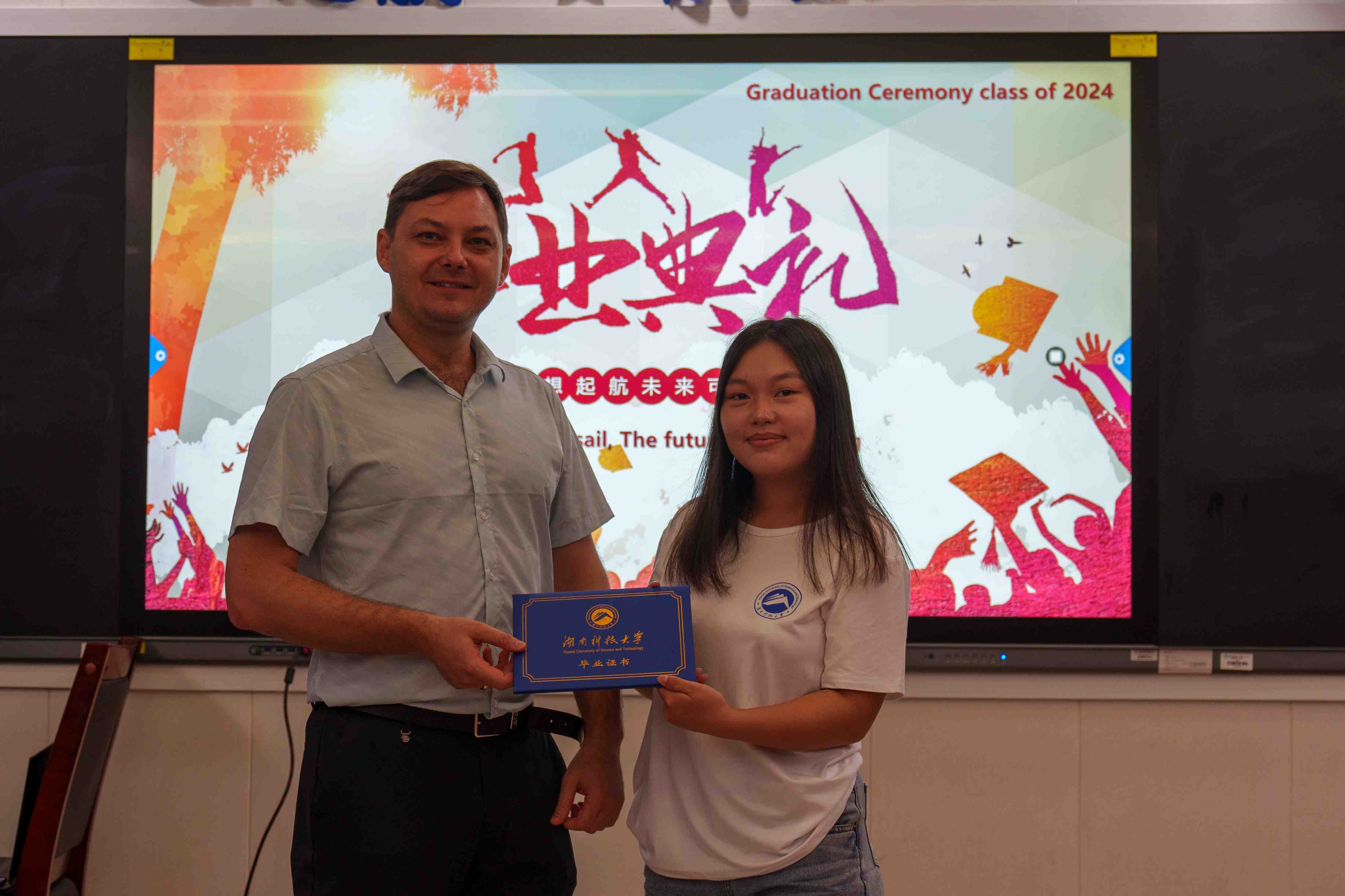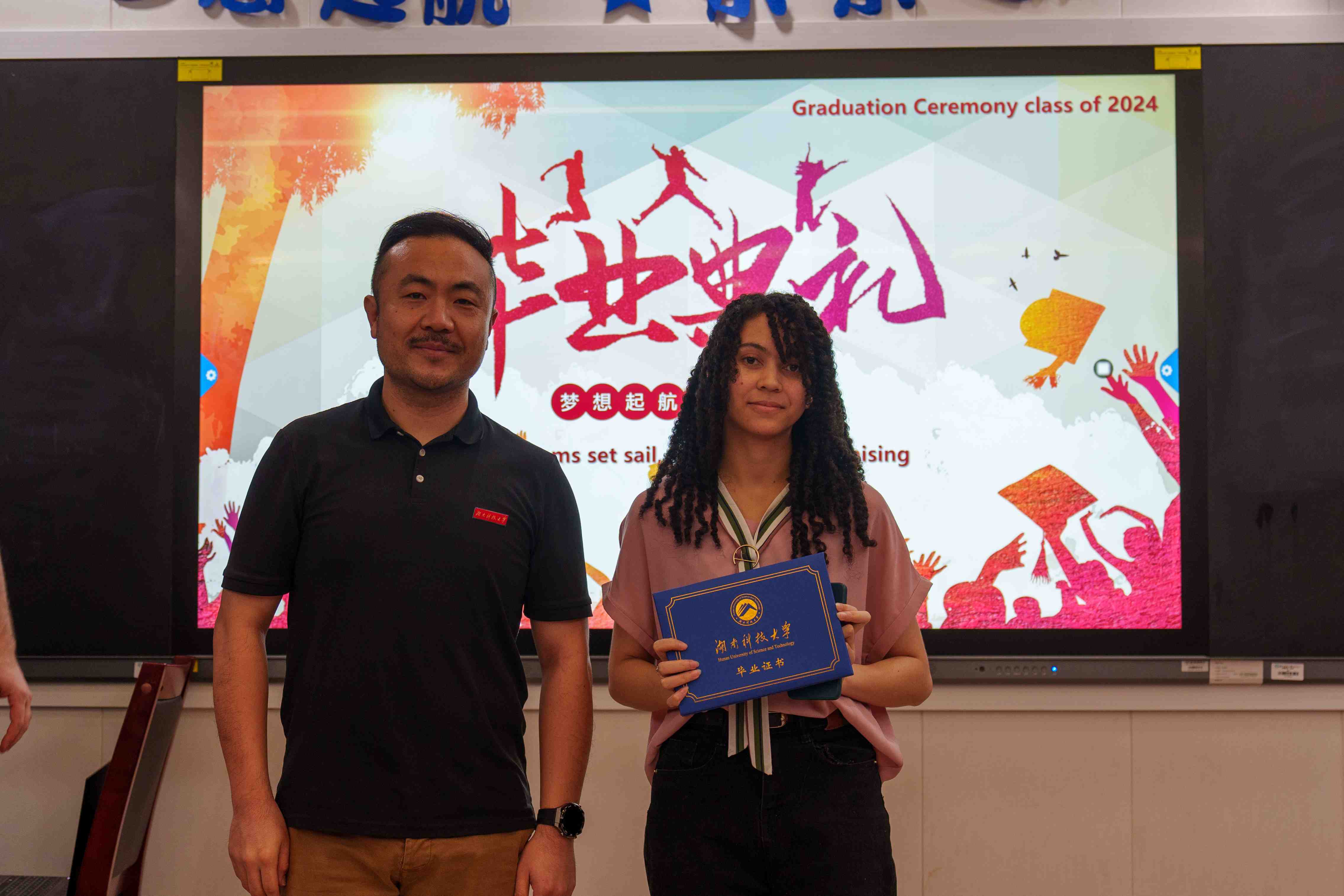 紧接着,激动人心的时刻到来。学院领导为优秀国际学生毕业生们颁发了结业证书,这是他们国际学生涯的最好见证。毕业生们面带微笑,满怀激动地从领导手中接过证书,这一刻的荣耀与自豪将永远铭记在心。为了留下这美好的瞬间,老师们和所有的同学们一起合影留念。随着快门声的响起,一张张照片记录下了这一刻的欢笑与泪水,也见证了国际学生们的成长与蜕变。