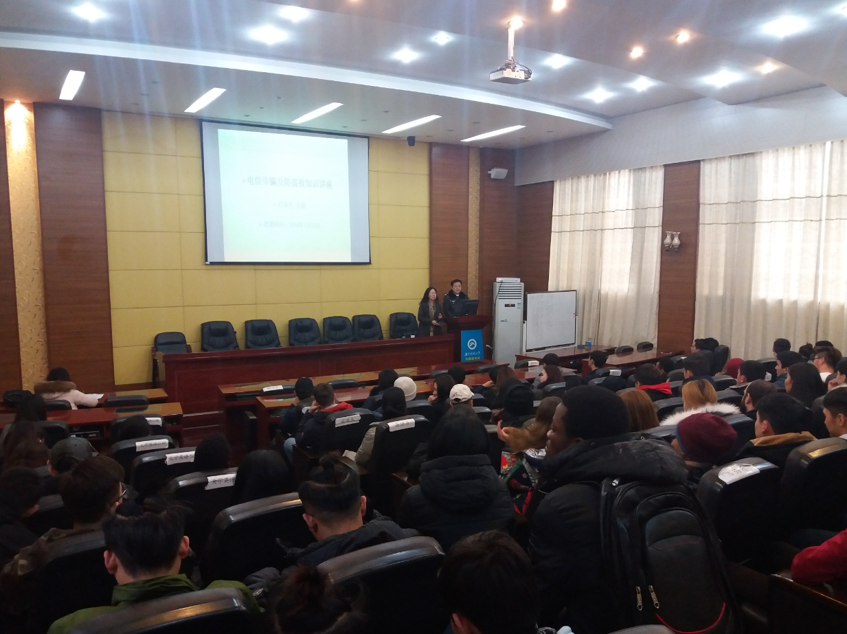 金警官从电信诈骗的常规手段介绍入手,以视频的方式形象地演示了犯罪分子实施电信诈骗的一般操作手法。微信和网络交易平台给生活带来便捷的同时,也为个人信息的泄露埋下隐患,为犯罪分子留下了可趁之机。金警官详细地介绍了如何识别和防范电信诈骗的手段和常识,告诫留学生不要轻易泄露个人信息,注意保护自身账号安全。另外,因寒假临近,讲座还详细介绍了一些加强安全,防火防盗的注意事项。强调留学生留校需要登记,宿舍内不能留宿未经登记和允许入住的人员,以及寒假出境后回校必须办理临时住宿登记等规定。