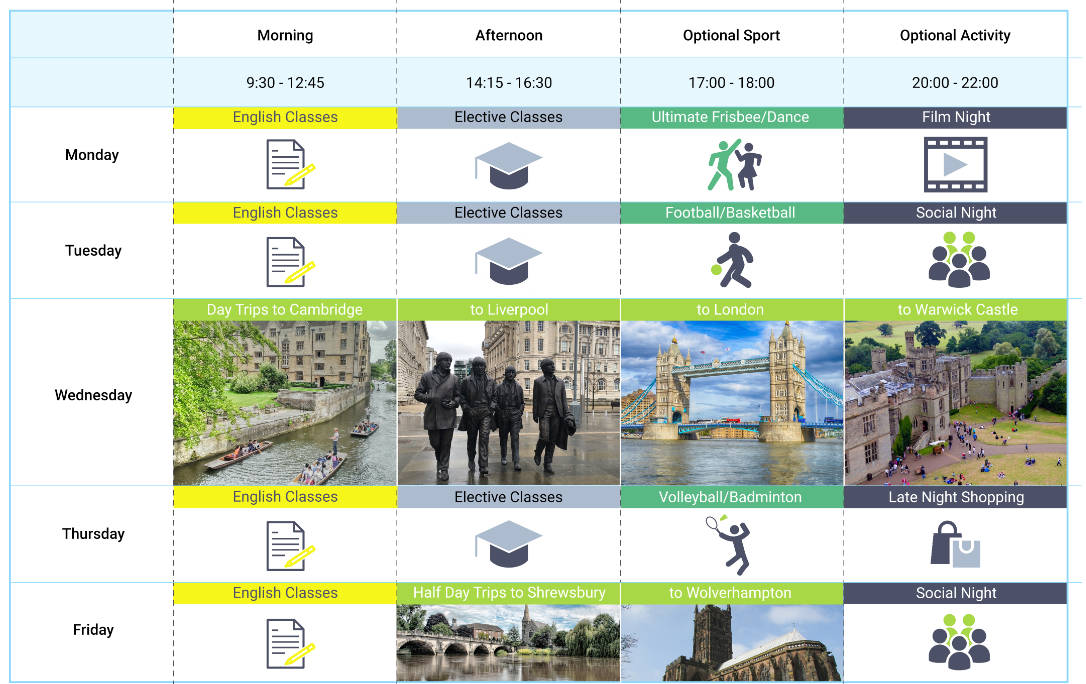 - 每周一次的短途旅行,包括牛津、剑桥、利物浦、伯明翰等旅行可选;